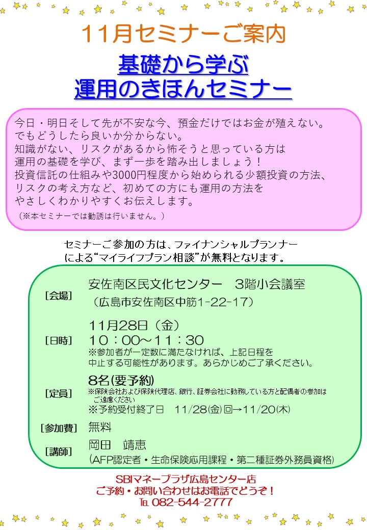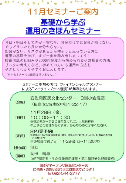 | セミナー名 | 【安佐南区】基礎から学ぶ運用のきほんセミナー |