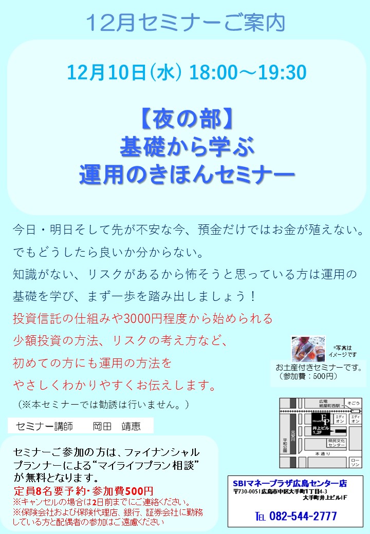 | 定員 | 各 8名(保険会社および保険代理店、銀行、証券会社に勤務している方と配偶者の参加はご遠慮ください) |