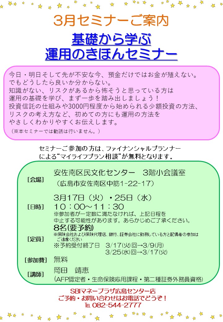 | セミナー名 | 【安佐南区】基礎から学ぶ運用のきほんセミナー |